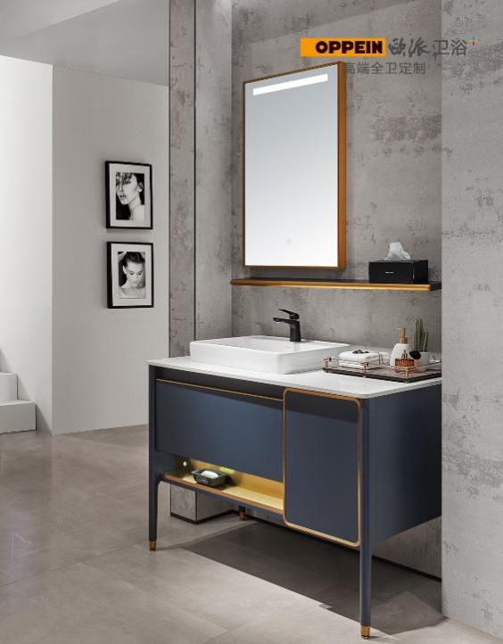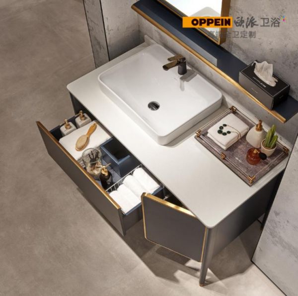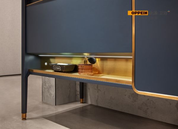 这款浴室柜,用孔雀蓝做主色调,优雅深邃,颇具贵族气质。金属是奢华的象征,用金线作为细节点缀,恰到好处的精致,不落入浮夸。