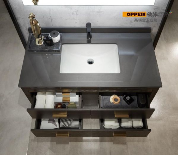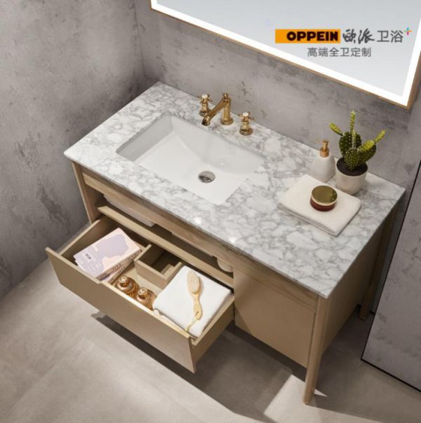 化妆品、毛巾、洗漱用品,零零散散的摆在台面过于碍眼。台下双层抽屉,容量大,正好将杂乱物品收纳起来。