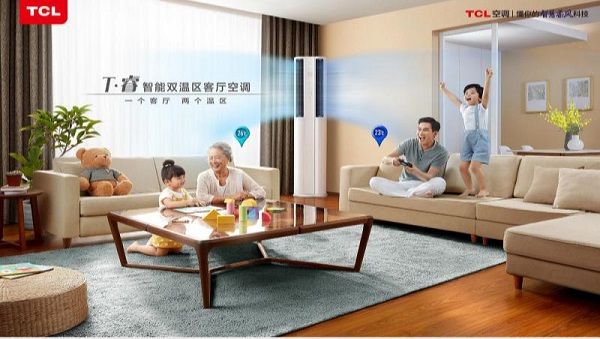 TCL ·T睿智能双温客厅空调在设计时充分考虑到了中国家庭的客厅沙发摆位,能够为两边沙发区域输送不同温度的风。在同一个空间里,空调两侧就能拥有温差为3°C的不同温度,感觉就像买了两台空调回家一样,解决了同一空间里不同的人对不同温度的需求。比如孩子和老人体质偏弱,在家休息一般喜欢将空调开到26℃,但是男主人又希望在客厅边运动边吹冷风怎么办?有了TCL ·T睿智能双温客厅空调,这个烦恼就能一吹而散了。