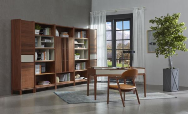 清代著名学者李渔在《闲情偶寄》一书中指出书房崇尚“宜简不宜繁”,力求“高雅绝俗之趣”。在朗萨家居-纳维亚系列风格的书房中,不加雕花装饰的简洁形态与深稳的造型,反映了极简主义的审美风潮,让人在书房邂逅一场艺术;咖啡色面板与胡桃木纹的的融合带着天然的沉稳气息,与空间相呼应,在简约设计中揉入了自然的艺术,成为了生活大放异彩的催化剂,让书房成为诗意的栖居;用材美而坚,用工朴而妍,更与“书房之壁,最宜潇洒”的心态不谋而合。在这样的书房展卷而读,徜徉尽兴,感受清风自来的意境,体会丰富多彩的人生,别有一番趣味。
