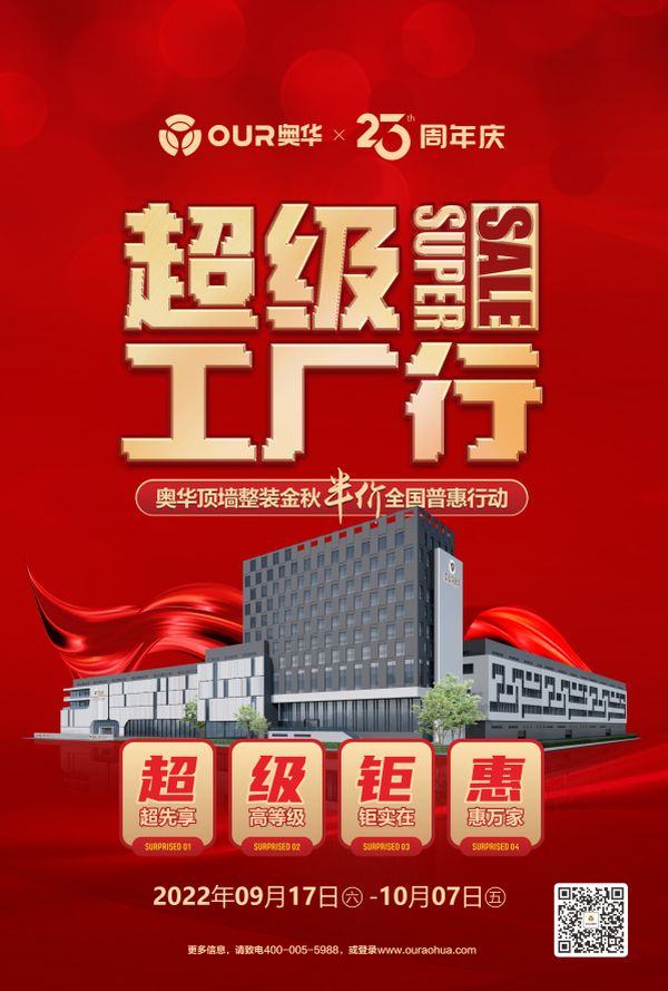 在消费不断升级的市场环境中,昂贵的物价,让品质家居生活成为了不可奢望的梦想。想要获得舒适美观的品质生活,又不想花费高昂的价格装修,奥华成为了不二之选。奥华让房子成为家,心安居室,致力为消费者提供美好而实惠的家居设计方案。现推出超级工厂行活动!钜惠诚意十足!奥华顶墙黄金周1折抢工厂,全国1000+专卖店超级钜惠,进店1折限量抢超级99卡,立抵4600元!还不快来参加
