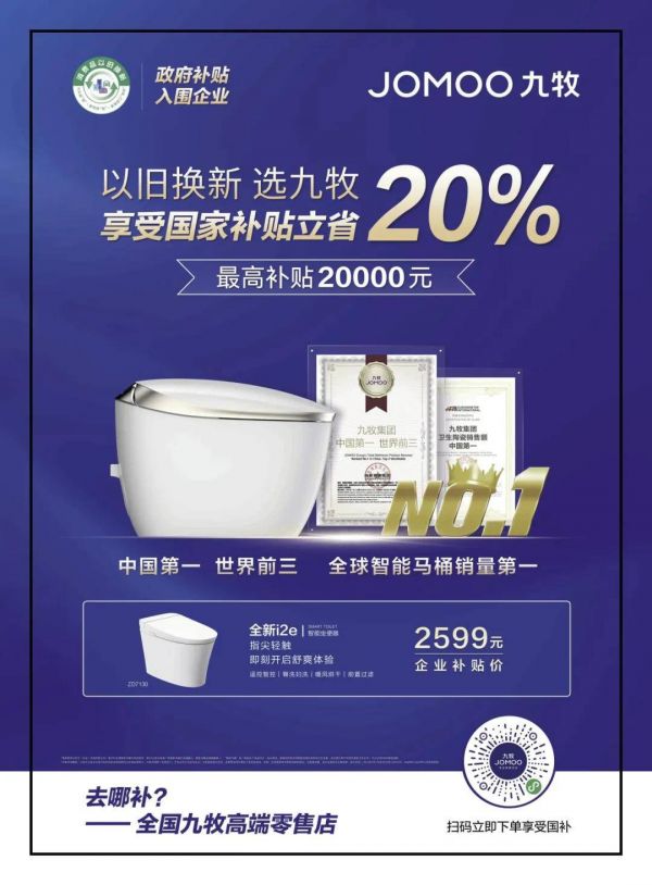 以旧换新,政企双补。九牧不仅要让消费者买得放心、用得舒心,更要让消费者买得实惠。今年以来,九牧积极推广“以旧换新”活动,携手京东等电商平台、居然之家、红星美凯龙等大型家居卖场,通过提供百亿补贴等实际举措,让消费者享受“以旧换新,选九牧享受国家补贴立省20%,最高补贴2000元”等实实在在的福利。同时,九牧还深入全国上千个老旧社区,推动老旧小区卫生间焕新改造,让高品质的产品和服务惠及广大消费者,展现了家居头部品牌的责任与担当,为当下消费市场做榜样。