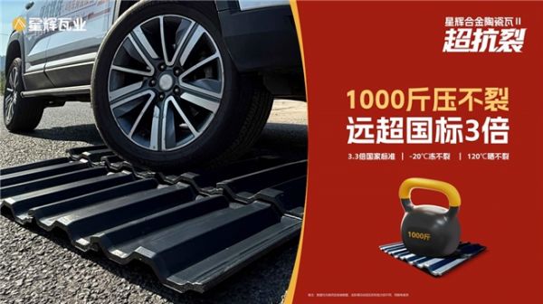 为了更直观地展现产品的卓越品质,星辉瓦业针对合金二代产品的强度进行了严苛的重压抗裂测试。测试采用车压瓦的形式——驾驶1.4吨汽车直接压过瓦片,最终瓦片完好无损。