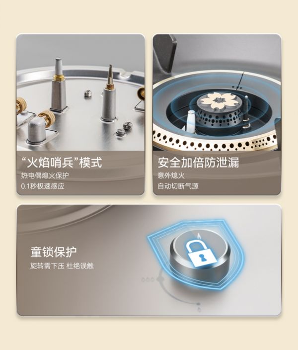 除此之外,樱花御风系列燃气灶JZT-S860G还配备多重安全防护系统:热电偶熄火保护装置,可在0.1秒极速感应;安全加倍防泄漏系统,可在意外熄火时,自动切断气源;更有童锁保护的设计,从源头避免误触。安全多重守护,让家人无忧享受烹饪时刻。
