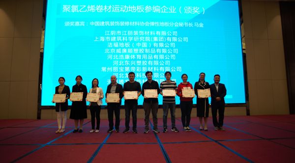 中国建筑装饰装修材料协会弹性地板分会秘书长马金为聚氯乙烯锁扣地板和聚氯乙烯卷材运动地板参编企业颁奖。