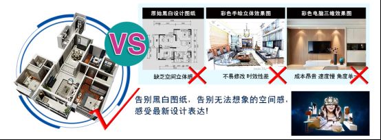 戴上VR眼镜之后,顾客可以穿越到自己的新家走一走,全方位的观看装修后的立体效果,不放过每一个小细节。如果设计中出现了不满意的部分,通过VR技术我们也可以随意更换房间中物品的摆放、墙纸的颜色、地板的花纹。即使所有的方案都没有达到预期,顾客还可以5分钟迅速掌握VR设计的使用方法,任意切换房间风格,随意拖拽海量的家具模型,直到设计出自己喜欢的效果,再也不用担心平面设计图会将装修效果过度美化了。