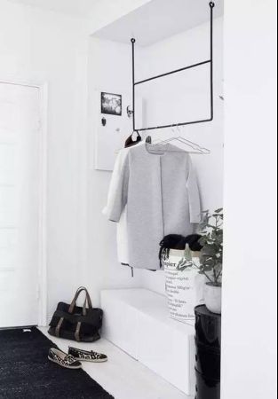 悬挂杆的使用主要是为了方面挂衣物,白天穿的外套随手挂在玄关处,方便拿取又便于搭配。