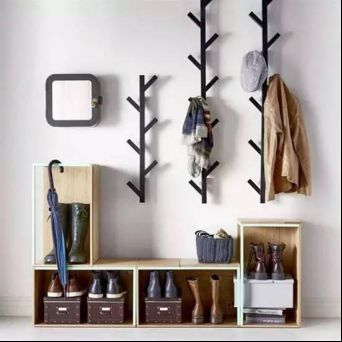 除了平直悬挂,树杈式的置物架也很实用,不仅可以收纳衣物,帽子、围巾等小饰品也可以一并放置在上面。下放设置的鞋柜也很巧妙,高的柜子可以放置长筒靴、高帮鞋等,低的柜子还可以当做换鞋凳来使用。