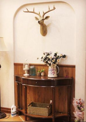 鹿头墙饰+鲜花+小木桌,将浪漫的法式风情搬回家。