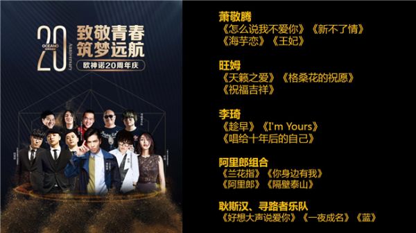 2018年8月8日,“致敬青春·筑梦远航”欧神诺陶瓷20周年庆即将于佛山开幕,著名歌手“雨神”萧敬腾、中国好声音全国总冠军李琦、星光大道全国总冠军旺姆、央视青歌赛专业组银奖阿里郎、中国好声音汪峰战队四强耿斯汉、寻梦者乐队等一众当红明星齐聚佛山,在欧神诺20周年晚会现场倾情献唱。