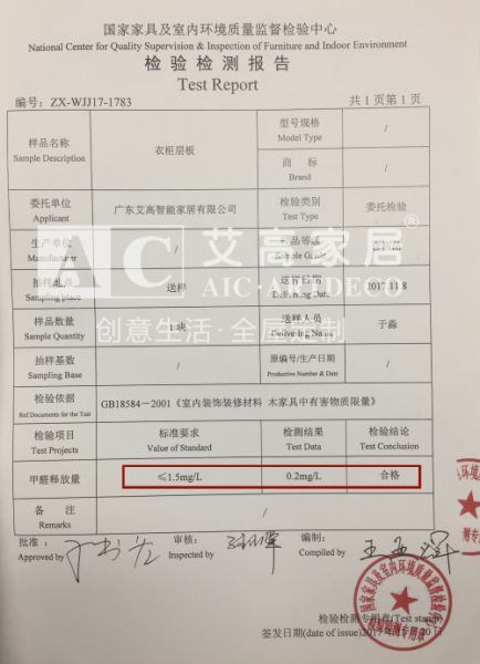 艾高家居使用的原态实木板,经检测结果为0.2mg/L,欧松板为0.1mg/L。完全能达到E0级标准,也能达到F★★★★级标准。