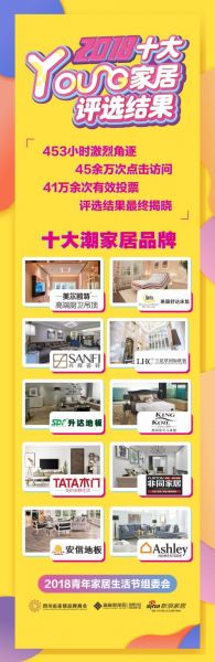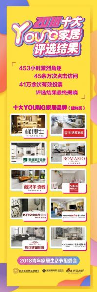 梯博士木业、生活家地板、蒙娜丽莎瓷砖、罗马利奥瓷砖、诺贝尔瓷砖、顺丽木门、金意陶瓷砖、瑞士卢森地板、马可波罗瓷砖、欧神诺陶瓷获得“十大YOUNG家居品牌(建材组)”;杰西卡沙发、宝玛仕家具、丹尼诗家具、宝窝家具、简舍.家家具、雅兰床垫、新特丽灯饰、维维贝拉家居、博领家具、华意空间-摩地纳获得“十大YOUNG家居品牌(家具软装组)”;美尔凯特集成吊顶、兴辉瓷砖、升达地板、TATA木门、安信地板、舒达床垫、兰花草整体软装、金可儿床垫、非同家居、爱室丽家居获得“十大潮家居品牌”。