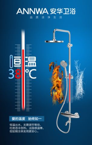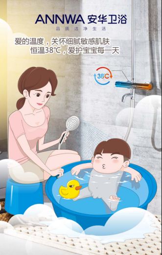 安华卫浴推出的创新恒温花洒却可以解决这一痛点,其设定的“恒温38℃”可以帮助妈妈省掉给宝宝沐浴过程中的“试探”步骤,小孩对温度非常敏感,皮肤也比较娇嫩,但因为太小表达不清,所以宝妈们经常忽略了宝宝们的感受,这时候用恒温花洒调试好水温,就能避免宝宝着凉或烫伤了。恒温38℃,爱的温度,关怀细腻敏感肌肤,爱护宝宝每一天。