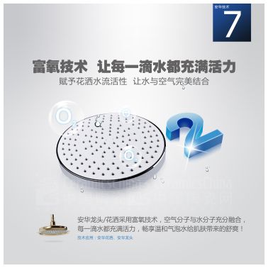此外,安华卫浴系列花洒产品应用“富氧”洁净核心技术,特别为产品添加的水氧融合组件,将空气注入到水流中,空气和水的比例达到1:2,相对普通花洒节水达30%。环保节能的同时,清洁效果依然出色,富含氧离子水流冲在皮肤上也更为柔和舒适,宝宝洗澡更舒适,妈妈放心啦!