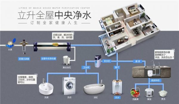 立升全屋中央净水系统以立升中央超滤净水器为核心,安装在入户总管处,将全屋的水在总管处进行净化处理,中央净水分管流向厨房、卫生间等,再根据水质特点和用水场所,选择相应的末端超滤伴侣,实现家庭分质供水, 提升净水生活品质。