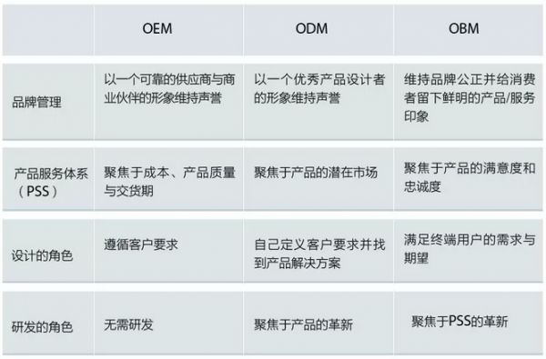OEM是指来图来样加工,溢价能力是最低的,产品无须自己研发,设计完全遵循客户要求,主要从事的是产品的结构和工艺技术设计,企业的核心竞争力聚焦于成本控制、产品质量和交货期等三个方面,成功姿态在于如何以一个可靠的供应商在商业伙伴那里维持形象、获得声誉。ODM是指自己开发产品供商业伙伴选择,会有一定的溢价能力,除了需要有OEM的一些能力外,还得聚焦于产品的革新,需要在充分理解客户需求的前提下自己定义客户要求,找到产品解决方案,满足的是产品的潜在市场,要以一个优秀的产品设计者身份来维持声誉。前两者都是B2B模式,而OBM是B2C或B2B2C模式,是自主品牌的做法,溢价能力最高,但难度也是最大的,必须聚焦于产品服务体系(PSS)的革新,也就是说仅有产品上的表现是不够的,还需要建设服务与传播能力,旨在满足终端用户的需求与期望,关键是产品的满意度和忠诚度,成功要素是维持品牌公正并给消费者留下鲜明的产品和服务印象。