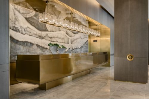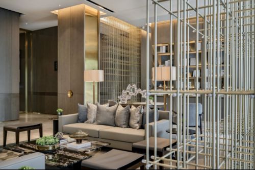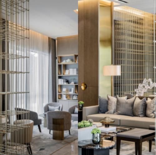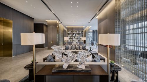 在空间形体表达上,运用虚实交错的手法,墙体部分嵌入金属构件,使空间形成一种剥离的状态,与空间的整体意境对立又融合。地面运用天然纹路大理石铺贴搭配墙面柔和暖灰木饰面,构成丰富的内涵。