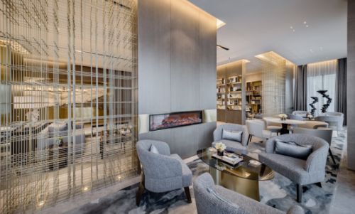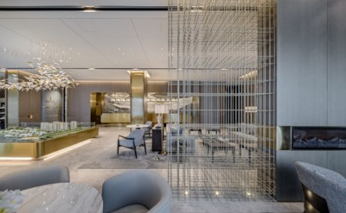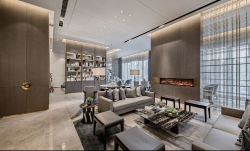 洽谈落客区,沙发摆放形式进行了多种方式组合,从而带给人们丰富的空间角度感受,在虚实交错的墙体中,植入壁炉,飘动的炉火宛如朦胧的远山,笼罩着一层轻纱,影影绰绰。