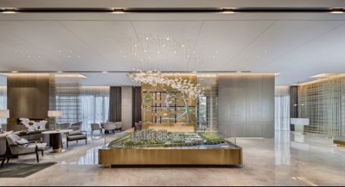 洽谈区是由多个功能空间通过虚实的墙体围合而成,是整个销售中心的重要之所,金属的销控水吧台搭配拥有五色石纹路色彩特点抽象的画作,形似落叶飘花的艺术吊灯,光影艺术的交叠,诉说着空间行云流水般的自在风韵。