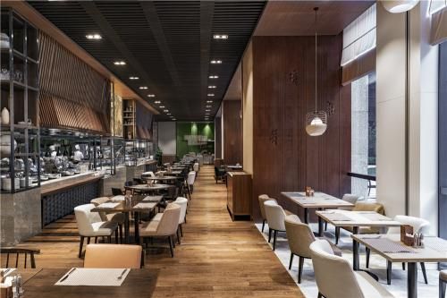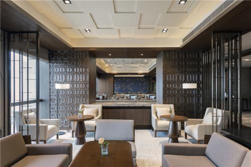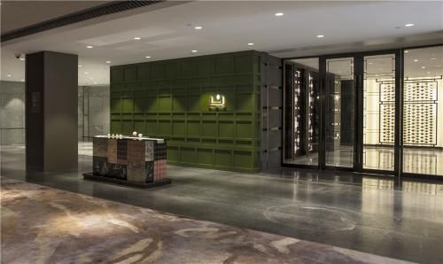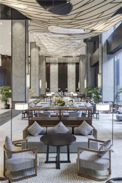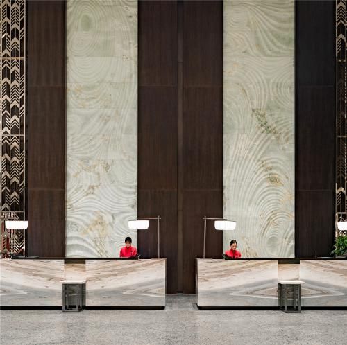 酒店大堂气势宏伟、素净雅致,充分体现亲近自然的精神。整体色彩及材质沉稳厚重,尽显安定、和谐之感。通过不同高度的尺度关系,丰富空间的层次感,由放至收,由动至静,让宾客慢慢远离城市喧嚣,进入宁静自然的“家”。设计师因势而宜,借助无锡当地地域的文化符号,在大堂酒廊上空营造了一个大型的“太湖石”艺术装置,为空间注入东方文化的韵味。