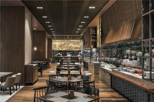 被誉为“江南水弄堂,运河绝版地”的南长街有着无锡当地典型的古运河畔江南人家原生态风貌。街区内民居建筑丰富多彩,粉墙黛瓦、花格木窗、前店后坊,形成了具有浓郁地方特色的院落式、竹筒式、独立式的枕河人家。全日餐厅的设计灵感就源于热闹的市井街市特色。设计师将街市特色抽象的运用到开放式备餐台的设计中,采用简洁的符号化古建筑语言来描述演绎,同时在台面上方又融入一些市井老百姓的生活场景图案,生动而有趣。