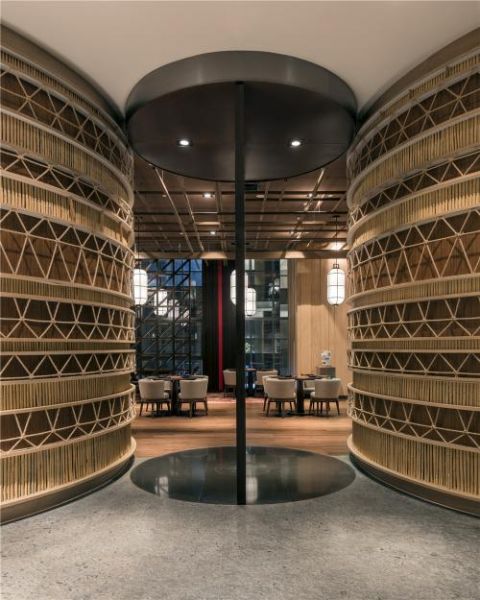 无锡当地的自然纹理与日式传统图案相结合,呈现出一个富有异域风情的特色餐厅。肌理丰富的竹、藤、木等自然材料交错层叠,营造出丰富的视觉效果。简约精致的日式ASANOHA图案的大范围运用,创造出既完整一致又层次丰富,既对比鲜明又融洽和谐的新空间。