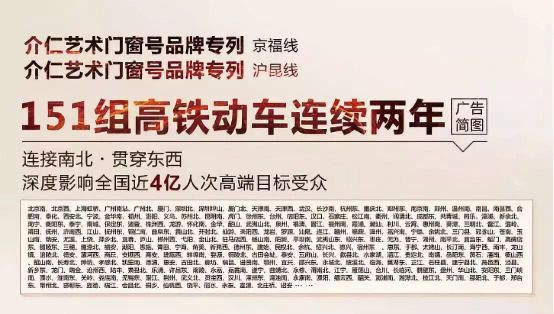 此次介仁斥巨资投入高铁广告,采用高铁传播营销新模式,不仅彰显了企业雄厚的实力,有助于品牌影响力的扩大,更为经销商打开门窗亿万级消费市场提供了强有力的保障,进一步拓展了以高铁出行为主的客源市场,让更多的高铁旅客,通过这一形式了解介仁、熟知介仁,实现介仁更高领域、更深层次的发展。