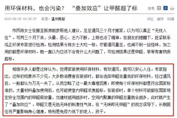 以上例子说明,单个家具的环保指标是合格的,但如果把它们都集中在一个小空间里,可能就超标了。因此,甲醛的叠加效应也逐渐成为室内装修甲醛超标的主要原因。