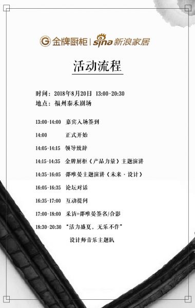 8月20日在福州泰禾剧场,金牌厨柜与新浪家居共同携手举办一场以“设计力量”为主题的设计师论坛。邀请台湾鬼才设计师邵唯晏为福州设计师带来“未来•设计”的主题分享。让我们在福州相识、相知、相遇,以开启未来的方式进行一场与生活的对话。