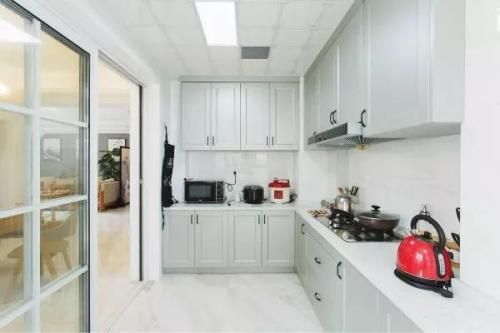 浅灰色属于无色彩系,是介于黑与白之间的一种颜色,穿插于黑白两色之间。灰色是最中性色调,也可以和任何颜色进行搭配,因此在许多的装修场合中,灰色都是一个不错的选择。厨房烤漆门选用浅灰色,不仅对整体空间的深浅色起到融合协调作用,在视觉上也能使空间看上去更加明亮、宽敞。