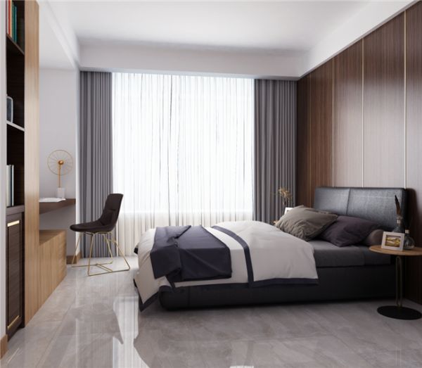 灰色调用于卧室,带来一点安抚的气息,让整个卧室沉静下来,不是冷色调的距离感,也不是暖色调的沉溺感,而像是轻柔的风拂过,带着温柔的意味。处于这样的空间中难免让人不自觉的舒缓下来,自然和谐令人暂时的抛却一切烦恼。搭配偏深色系的家具和白色的墙壁,风格简约又带有现代化气息,尽显优雅。