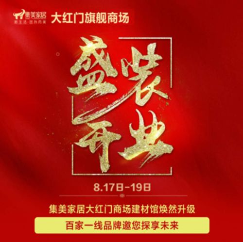 为了庆祝建材馆升级改造成功,集美大红门旗舰商场将举办盛装开业庆典。8月10日—16日,大红门旗舰商场将从多种渠道向京城百姓发放邀请函,诚挚邀请您前来参与庆典。每张邀请函即为100元代金券,凭邀请函购物即在8月17日至19日享受优惠。