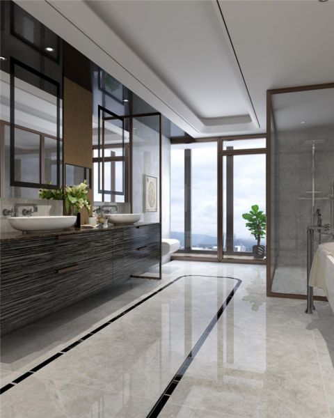 浴室空间是相对于比较私人的区域,采用自己喜欢的色调,深色木质的洗手台,理论上在一个相对富有设计感,开阔舒适的环境,人们的身心是容易放松的。