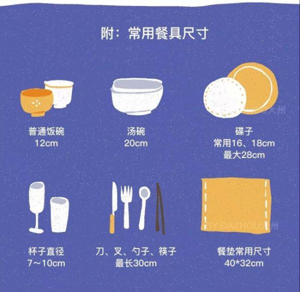 ▲ 附一个常用餐具尺寸图,可以按平时饭菜的量估算一下需要多少公共区。碗,碟,杯的尺寸为直径长度。