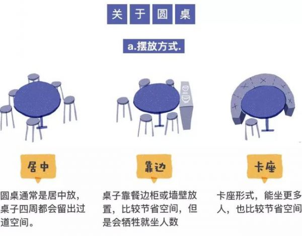 一般的餐厅都是方形的,摆放圆桌时至要少有两边留出通行空间,方便人入座哦!