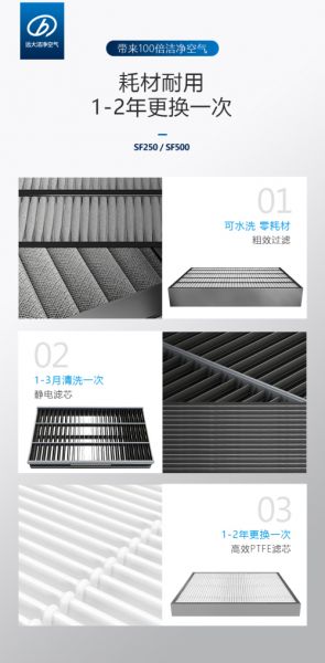 新风系统维护最主要的方式是定期更换或清洗滤网。高效滤网通常不能清洗只能换,初、中效滤网根据厂家的说明书,有些可以水洗。以远大新风机SF250为例,这款机器属于立柜式新风,它在维护便利性上优于吊顶机,不用登高,用户自己可以轻松更换滤网,进行机器内部清理。它的粗效过滤器和静电除尘器都是金属材质的,比较好清洗,只需要1~3个月清洗一次;而第三级超级过滤器只需要1~2年更换一次即可。