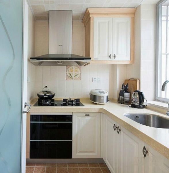 L形的4平米以上的小厨房布局中,可以实现“三角形工作空间”。工作区沿墙作90度双向展开成L形,可方便各工序连续操作。如果是开放式的L形,可将短的一边设计成隔断的工作台,或直接设计成小餐桌。
