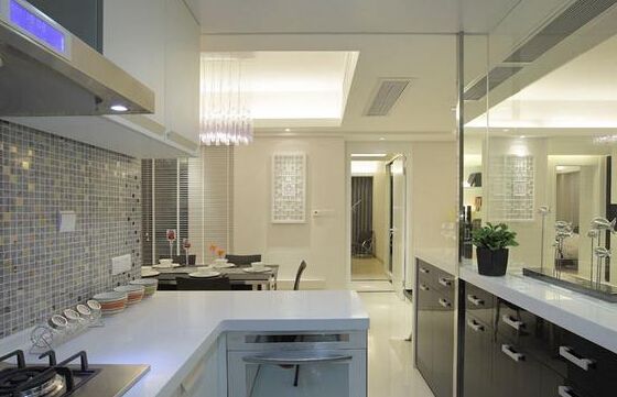 这种面积的厨房,功能上一般只考虑备餐的作用。少数可以用活动搁板作出简单的就餐区。装修时的一个整体原则就是简约派。风格切忌杂乱,以直线条的现代风格是最好的选择。颜色可以高调也可以淡雅,但是色彩一定要单一。如果希望色彩上略有变化,那么至少也要保持色调的统一。