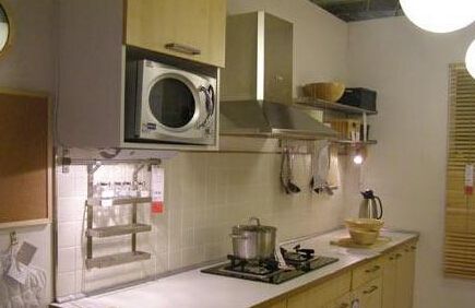 在小厨房中,有一些弹性的收纳空间弥足珍贵,可以好好利用,比如,可以在地柜与吊柜间之间,安装一个墙面层架,放置微波炉,或安装层板、挂钩,调料瓶、铲子、勺子等。在做橱柜时,留出一个简单空位放置一个带滑轮的不锈钢架。上面可以摆放一些常用物品,用完后推回原位,这样即节省空间,也方便使用。