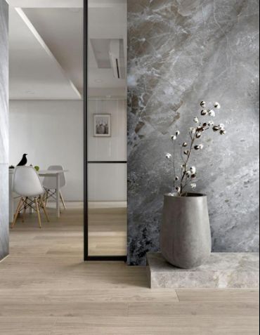 箭牌风尚大板“卡瓦格灰”以黑、白、灰三色作为空间地面的主色出现,烘托出文雅与风度,犹如一幅泼墨的画卷。随着时间空间的变化,娓娓道来东方独有的气韵,淡雅而静气。砖面纹理交错纵横,表面光洁剔透,色调柔和统一,将大隐隐于世的超然之姿与现代都市的繁华完美结合,给长久生活在钢筋水泥森林中的人们一份难得的惬意自由感受。