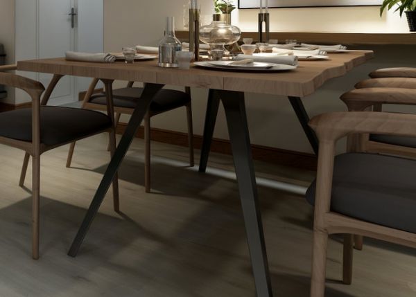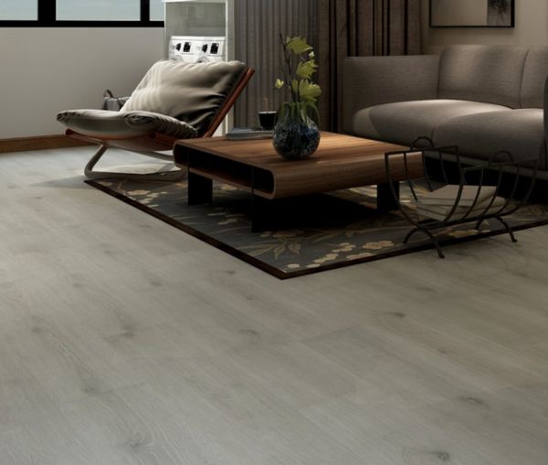 这款桑德橡木,色系偏冷,颜色略灰,给人以神秘、冷静的体验感,而这种感觉恰恰符合工业风。想要更好的与之融合,整体色彩选择灰色和原木色,比如在墙壁上,可以选择偏灰的山水图,在沙发的选择上,采用灰色的布艺沙发,在桌椅上,选原木色、偏黄色和黑色。