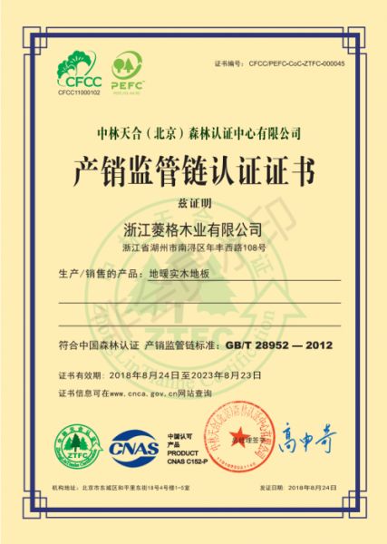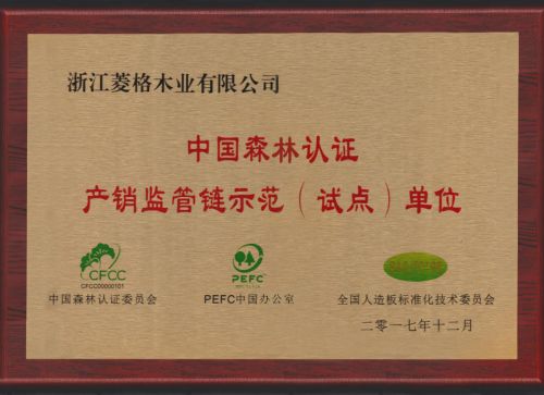 加快生态文明建设,践行绿色发展理念,积极发挥森林认证在促进森林可持续经营和林产品市场准入中的作用。8月24日,作为首批中国木竹产业“中国森林认证产销监管链示范(试点)单位”,浙江菱格木业有限公司(旗下品牌名称:天格地暖实木地板)通过笫三方审核,成为首批通过产销监管链认证的绿色环保企业之一。