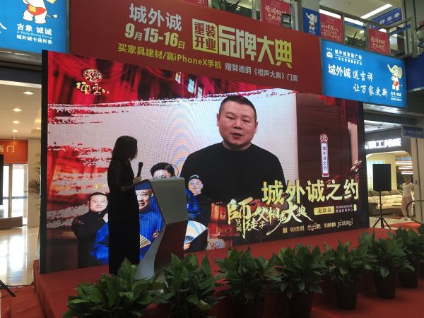 本次重装开业后的城外诚正好赶上了金九银十的黄金促销季,因此活动和优惠也是十分接地气。据介绍,9月15、16日,城外诚还将举行盛大的开业促销——家居品牌大典,五大场馆、千余品牌全场特卖、盛惠酬宾,更有百万现金红包、55寸液晶电视、iPhoneX手机、“相声大典”门票等缤纷好礼相送,并特邀素有小邓丽君之称的歌手盛燕亲临现场演唱助力。同时,9月21日晚,城外诚联手郭德纲师徒推出“2018城外诚之约——师徒父子相声大典”,顾客还可从城外诚门票承销点买到相声票。