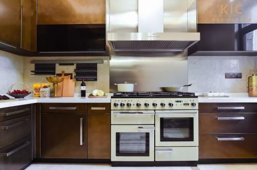 如果你亲手触摸柜体表面,会发现手感丝绸般柔润,且完全不留指纹;咖啡色的风格配合简单的金色线条,也成为整体风格的点睛之笔。作为全新的科技厨房,厨房配置了艺术设计感十足的电动上翻门,只需在柜底轻轻一触,便会自动开启,时尚感和科技感并存。