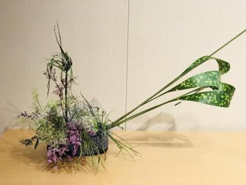 草月流花道不拘一格的花艺造型,以及无限可能的材料选用,在本次活动现场也得以充分感受。来自万仟堂和晓春教室的两位老师现场表演草月流花道,其中一作品用芦苇、芭蕉叶和竹子巧妙创作,植物枝条间的交错组合显得别样而灵动,带给人十分愉悦的视觉享受。晓春教室的老师分享说,点、线、面的比例,色彩的点缀考量,就是精髓。