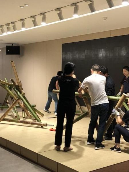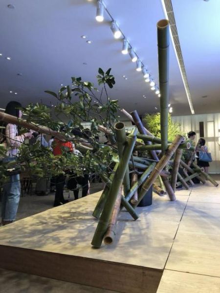 活动现场最让人震撼的,是来自草月流花道日本总部的老师们现场合力完成一件用竹来架构出的大型绿植装置。