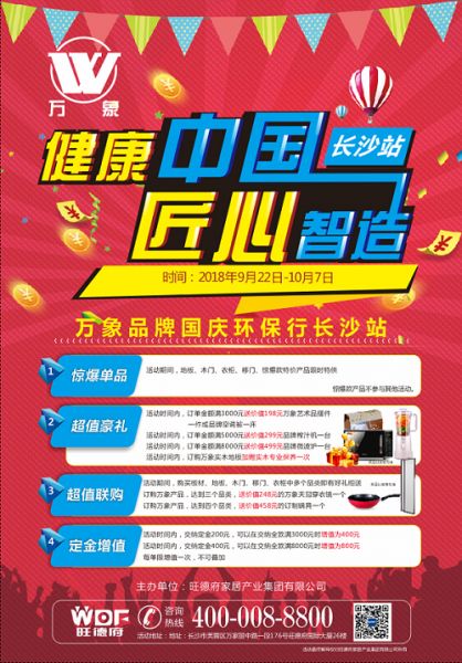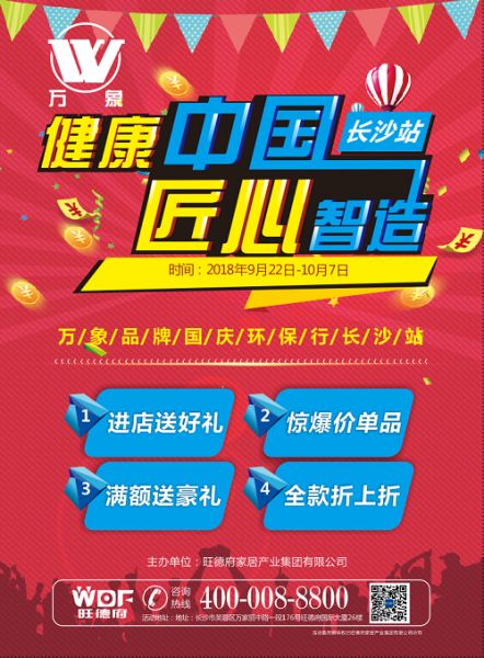 为回报消费者的支持与厚爱,旺德府集团再次组织了一场以长沙为中心,辐射湖南全境,影响全国的万象品牌国庆环保行活动,从9月22日开始,到10月7日结束,消费者只要在省内万象品牌的直营门店与万象品牌授权门店即可参加活动。
