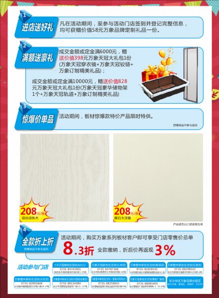 活动期间,需要购买板材的客户在门店签到并登记完整信息,就可以获得万象品牌定制的活动礼品一份;金额满6000元和10000元就能获得对应金额的万象天冠大礼包一份;全场惊爆单品外购物享8.3折优惠,交纳全款后,还能享受折后返现3%;需要购买地板、木门、衣柜等其他家居类产品的客户,金额满3000元、满5000元、满8000元也可以获得空调被、榨汁机、微波炉等相应礼品,要是购买实木地板,还能享受到一次专业的地板护理;购买万象品牌的多个品类,还能礼上加礼;还有定金增值的活动,同样的都是为消费者考虑过的;万象品牌更是在活动时间内,下调了部分产品的全国统一价,数百款受热捧的单品,进行活动特价专供。