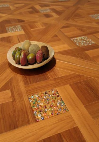 得高Garbelotto的Creater拼花系列另一款白金色橡木中间的威尼斯玻璃可谓是点睛之笔,仿佛公主头上的钻石王冠,将白金色橡木的纯净之美展现在世人面前。这种木材绝美质感与威尼斯玻璃流光溢彩的结合展现了不一样的独特魅力,木质的温润和玻璃的剔透这一切的创新之举融汇在这方方正正的拼花地板之中,营造个性化家居氛围。