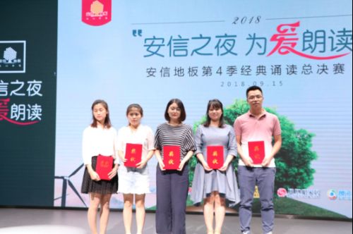 9月15日,“安信地板 为爱朗读”安信地板第四季经典朗读赛总决赛在上海圆满落幕。由网络投票产生的人气选手TOP5,从线上全国近四千份的参赛作品脱颖而出,在总决赛活动现场朗读经典文学作品进行PK。除了朗读风采的精彩演绎外,安信地板还邀请到音乐、教育、设计、公益各界的爱心使者,从不同行业、不同角度,倾情讲述爱的动人篇章。